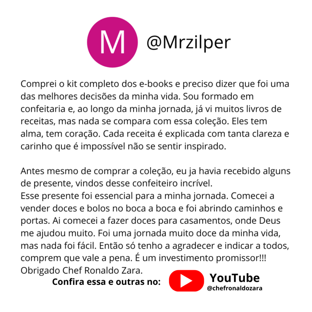 Chef Ronaldo Zara iniciou sua carreira em 1984 em uma renomada rede de supermercados. Com apenas 14 anos, foi promovido para o setor de confeitaria, marcando o início de sua jornada culinária. Em 1990, optou por abrir seu próprio negócio, liderando uma confeitaria por aproximadamente 28 anos. Com mais de 38 anos de experiência em confeitaria e padaria, compartilha seu conhecimento por meio de e-books e aulas online no YouTube, conquistando quase meio milhão de seguidores.