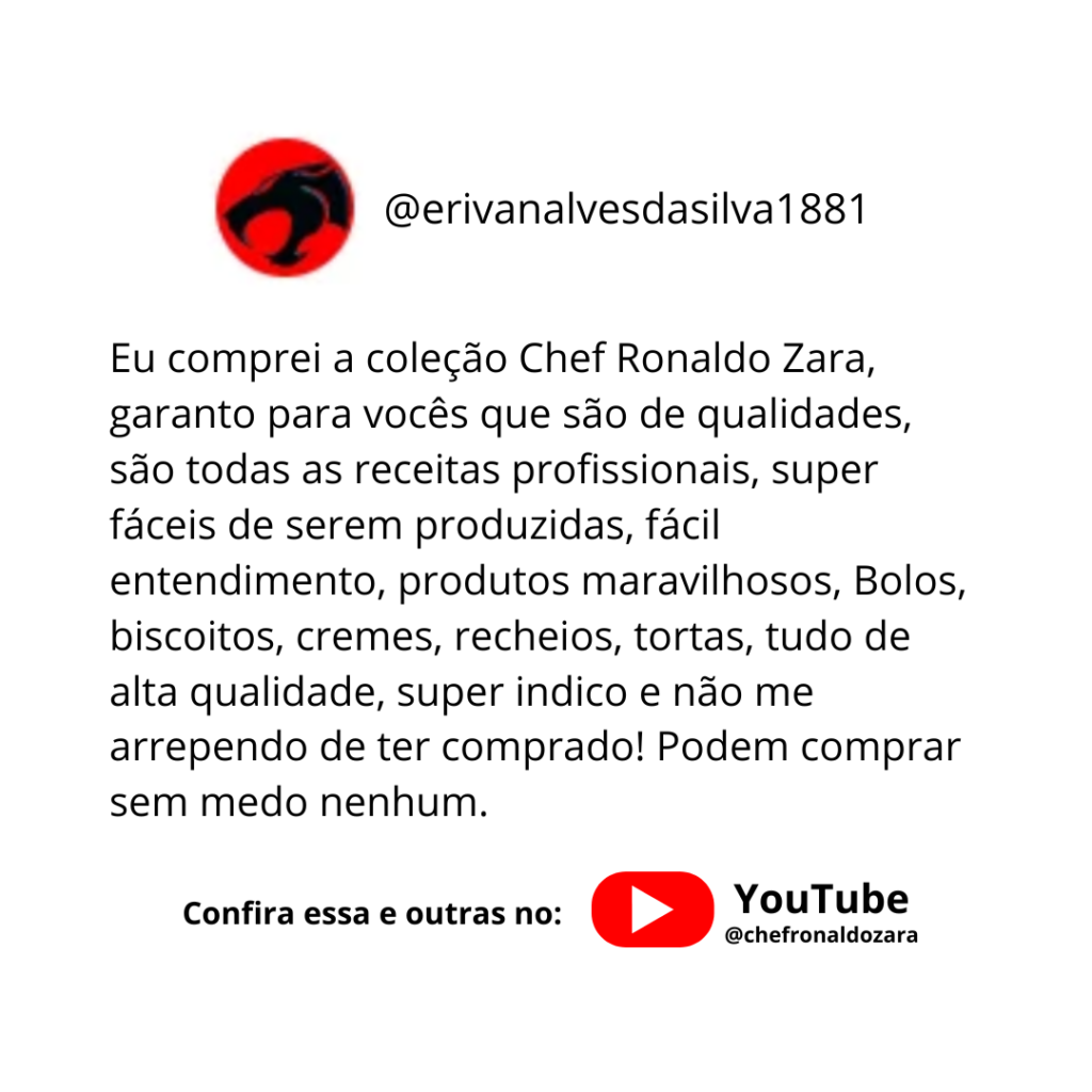 Dominando os fundamentos e as técnicas exclusivas (como a escrita profissional em bolos), seus produtos saem do “bom” para o “inesquecível”. Você não venderá “apenas” um bolo, um pão ou um doce, você venderá uma experiência com padrão de excelência – e é isso que faz os clientes escolherem você e recomendarem. Esta coleção é o seu mapa para se tornar uma referência.