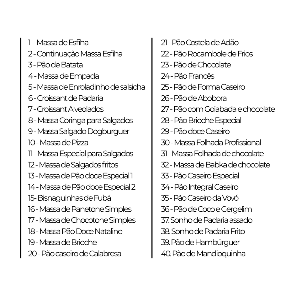 O cheiro de pão fresco saindo do forno é uma das melhores sensações da minha confeitaria. Depois de 28 anos, decidi compartilhar os segredos que encantam meus clientes! Este e-book traz 40 receitas de massas doces e salgadas, desde os clássicos consagrados até as criações exclusivas que viraram carro-chefe.